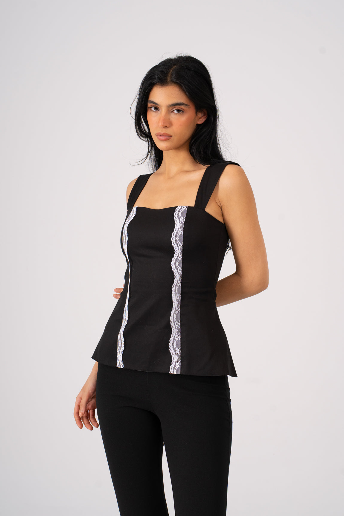 Vertical lace panels trace the body, adding delicate contrast against the strength of the fabric. The straight neckline keeps the structure modern and controlled โ balancing softness with authority.