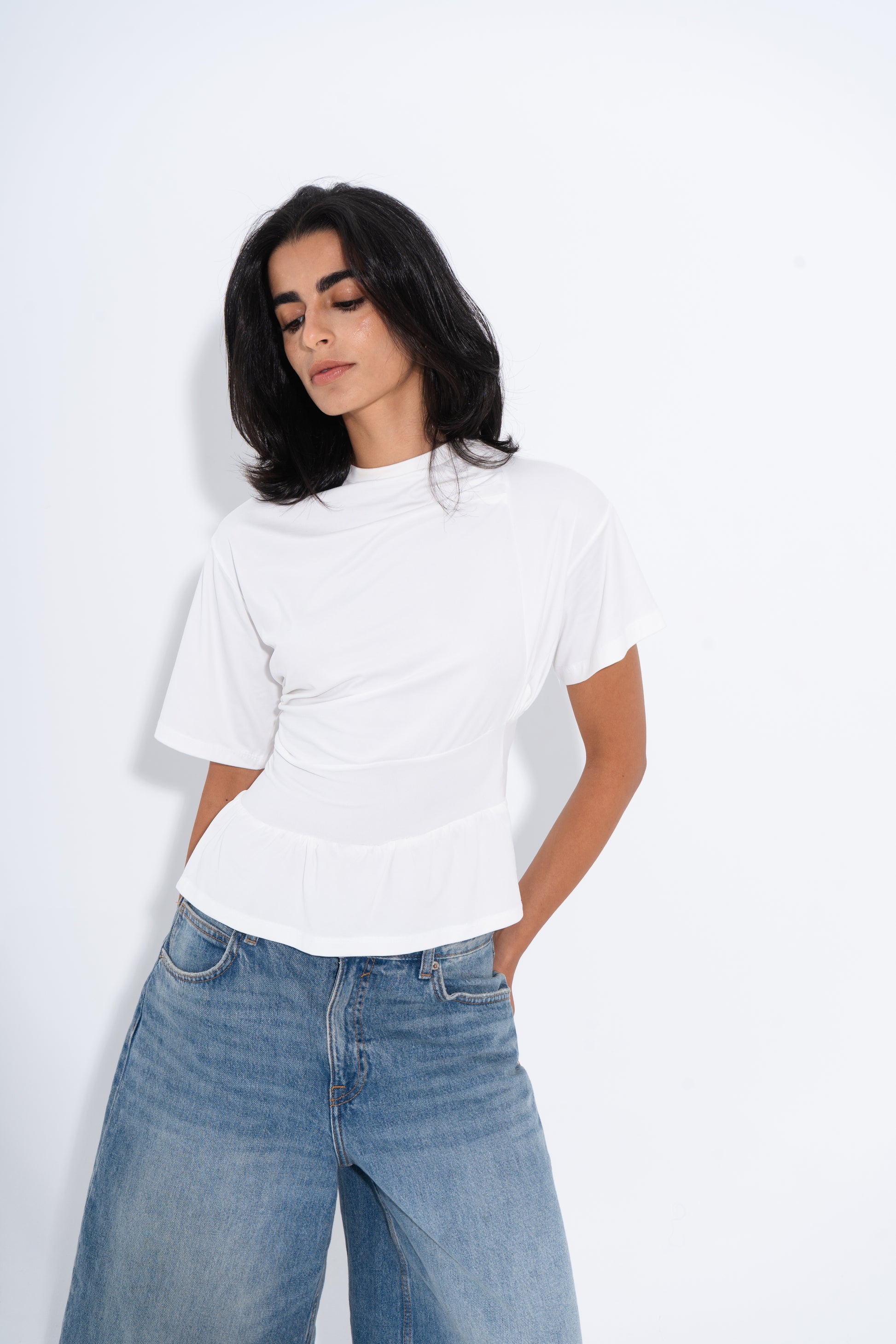 The Draped White Tee redefines a classic essential with soft detailing and a feminine silhouette. Designed with subtle draping across the bodice and a gathered peplum hem, this piece flatters the waist while keeping an effortless feel. Its relaxed sleeves and clean neckline make it a versatile staple that pairs seamlessly with both casual and elevated looks. Perfect for day-to-night dressing, this tee adds understated elegance to your everyday wardrobe.